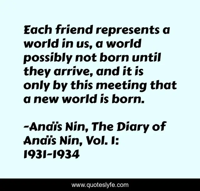 This page presents the quote "Each friend represents a world in us, a world possibly not born until they arrive, and it is only by this meeting that a new world is born.". Author of this quote is Anaïs Nin, The Diary of Anaïs Nin, Vol. 1: 1931-1934. .