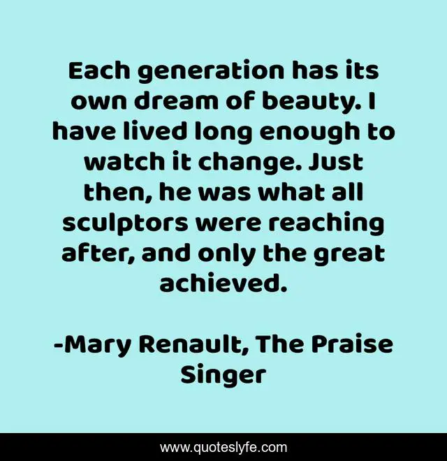 This page presents the quote "Each generation has its own dream of beauty. I have lived long enough to watch it change. Just then, he was what all sculptors were reaching after, and only the great achieved.". Author of this quote is Mary Renault, The Praise Singer. This quote is about adoration, dream, beauty,.