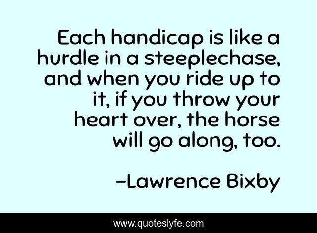 This page presents the quote "Each handicap is like a hurdle in a steeplechase, and when you ride up to it, if you throw your heart over, the horse will go along, too.". Author of this quote is Lawrence Bixby. This quote is about enthusiasm, success-strategies, inspirational,.
