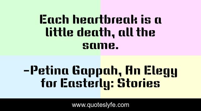 This page presents the quote "Each heartbreak is a little death, all the same.". Author of this quote is Petina Gappah, An Elegy for Easterly: Stories. This quote is about death, zimbabwe, heartbreak, petina-gappah,.