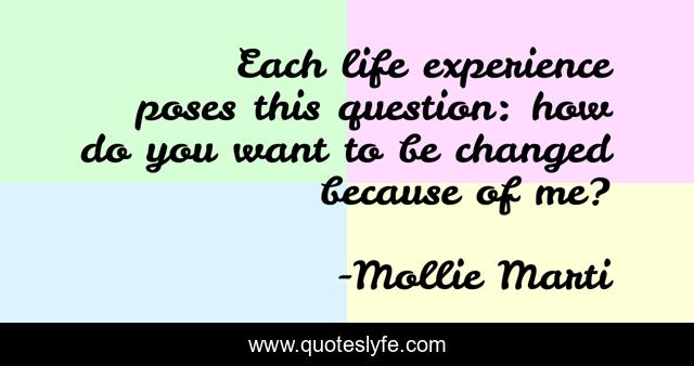 This page presents the quote "Each life experience poses this question: how do you want to be changed because of me?". Author of this quote is Mollie Marti. This quote is about clarity, servant-leader, hope, inspiration,.