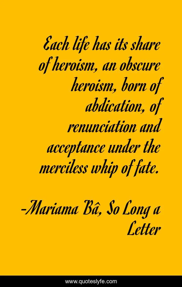 This page presents the quote "Each life has its share of heroism, an obscure heroism, born of abdication, of renunciation and acceptance under the merciless whip of fate.". Author of this quote is Mariama Bâ, So Long a Letter. This quote is about courage, fate,.