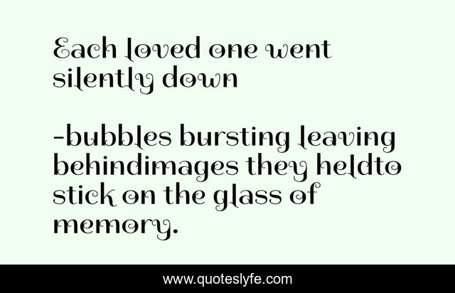 "bubbles bursting leaving behindimages they heldto stick on the glass of memory. Quotes." Quoteslyfe.com, 2025. Sat. 06 Dec. 2025. <https://www.quoteslyfe.com/quote/Each-loved-one-went-silently-down-133228>.
