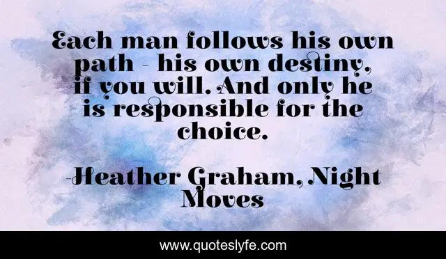 This page presents the quote "Each man follows his own path - his own destiny, if you will. And only he is responsible for the choice.". Author of this quote is Heather Graham, Night Moves. This quote is about positive, confidence, motivational, optimistic,.