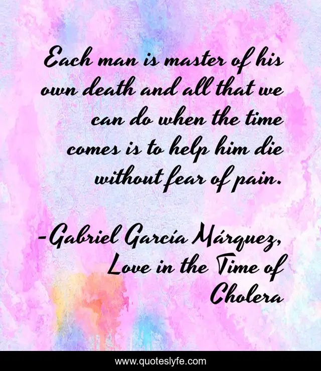 This page presents the quote "Each man is master of his own death and all that we can do when the time comes is to help him die without fear of pain.". Author of this quote is Gabriel García Márquez, Love in the Time of Cholera. .