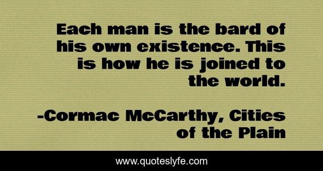 This page presents the quote "Each man is the bard of his own existence. This is how he is joined to the world.". Author of this quote is Cormac McCarthy, Cities of the Plain. This quote is about existence, meaning, life, fulfillment,.