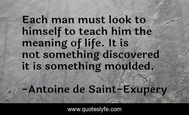 This page presents the quote "Each man must look to himself to teach him the meaning of life. It is not something discovered it is something moulded.". Author of this quote is Antoine de Saint-Exupery. This quote is about self, knowledge,.