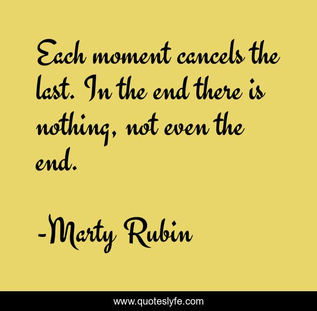 This page presents the quote "Each moment cancels the last. In the end there is nothing, not even the end.". Author of this quote is Marty Rubin. This quote is about moments, the-end, impermanence,.