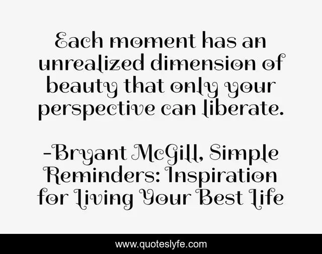 This page presents the quote "Each moment has an unrealized dimension of beauty that only your perspective can liberate.". Author of this quote is Bryant McGill, Simple Reminders: Inspiration for Living Your Best Life. This quote is about liberation, perspective, beauty, momentary,.