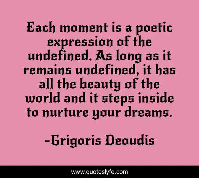 This page presents the quote "Each moment is a poetic expression of the undefined. As long as it remains undefined, it has all the beauty of the world and it steps inside to nurture your dreams.". Author of this quote is Grigoris Deoudis. This quote is about beauty, moment, undefine, poetic, nurture, expression, dreams,.