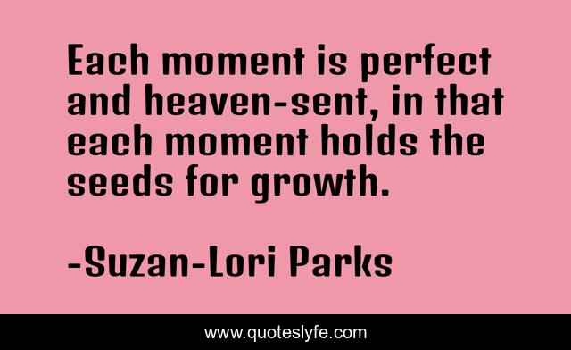 This page presents the quote "Each moment is perfect and heaven-sent, in that each moment holds the seeds for growth.". Author of this quote is Suzan-Lori Parks. This quote is about perfect, moment, growth,.