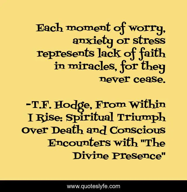 This page presents the quote "Each moment of worry, anxiety or stress represents lack of faith in miracles, for they never cease.". Author of this quote is T.F. Hodge, From Within I Rise: Spiritual Triumph Over Death and Conscious Encounters with "The Divine Presence". This quote is about miracles, faith, stress, anxiety, belief, quotes, worry, lack-of-faith,.