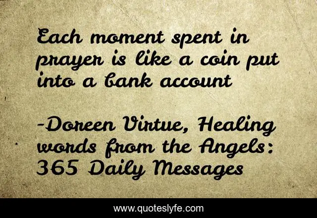 This page presents the quote "Each moment spent in prayer is like a coin put into a bank account". Author of this quote is Doreen Virtue, Healing words from the Angels: 365 Daily Messages. This quote is about angels, prayer,.