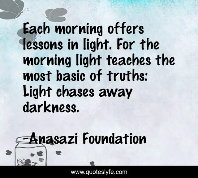 This page presents the quote "Each morning offers lessons in light. For the morning light teaches the most basic of truths: Light chases away darkness.". Author of this quote is Anasazi Foundation. This quote is about power-of-light, anasazi-foundation, light, light-and-truth, morning, light-and-darkness, native-american-wisdom, anasazi, wisdom,.