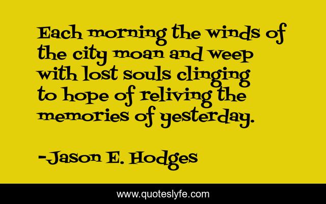 This page presents the quote "Each morning the winds of the city moan and weep with lost souls clinging to hope of reliving the memories of yesterday.". Author of this quote is Jason E. Hodges. This quote is about writers-on-writing, poetry, writing,.