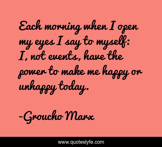 This page presents the quote "Each morning when I open my eyes I say to myself: I, not events, have the power to make me happy or unhappy today.". Author of this quote is Groucho Marx. This quote is about enthusiasm, happiness, inspirational,.