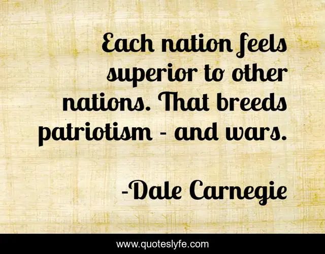 This page presents the quote "Each nation feels superior to other nations. That breeds patriotism - and wars.". Author of this quote is Dale Carnegie. This quote is about nation, nations,.