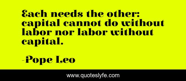 This page presents the quote "Each needs the other: capital cannot do without labor nor labor without capital.". Author of this quote is Pope Leo. This quote is about capital, labor,.