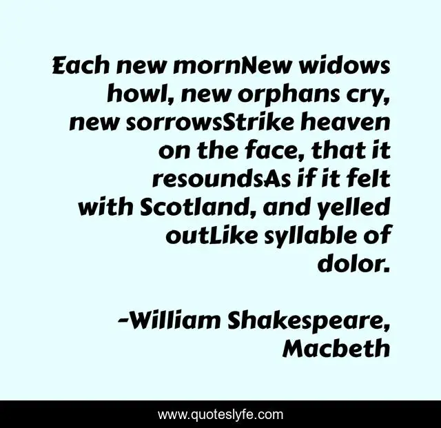 "William Shakespeare, Macbeth Quotes." Quoteslyfe.com, 2025. Sat. 06 Dec. 2025. <https://www.quoteslyfe.com/quote/Each-new-mornNew-widows-howl-new-orphans-150559>.