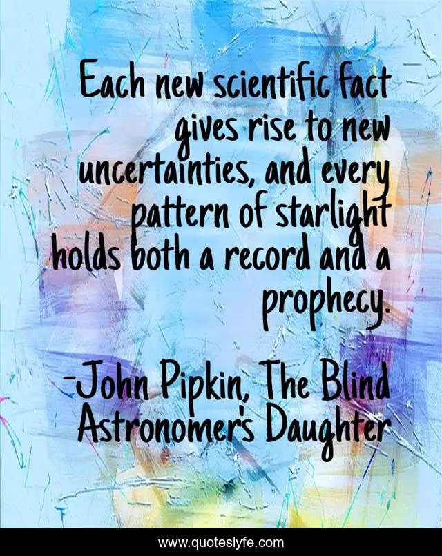 This page presents the quote "Each new scientific fact gives rise to new uncertainties, and every pattern of starlight holds both a record and a prophecy.". Author of this quote is John Pipkin, The Blind Astronomer's Daughter. This quote is about science, novel, astronomy, fiction,.