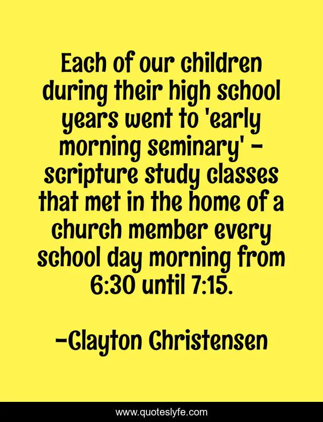 This page presents the quote "Each of our children during their high school years went to 'early morning seminary' - scripture study classes that met in the home of a church member every school day morning from 6:30 until 7:15.". Author of this quote is Clayton Christensen. This quote is about home, school, children,.