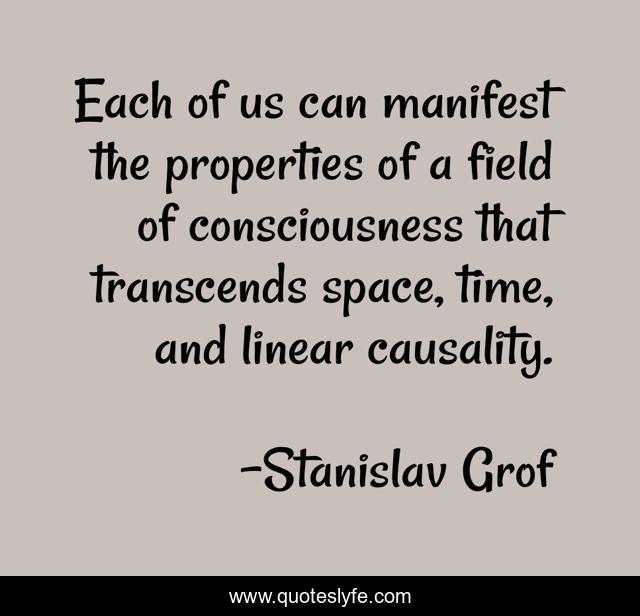 This page presents the quote "Each of us can manifest the properties of a field of consciousness that transcends space, time, and linear causality.". Author of this quote is Stanislav Grof. This quote is about consciousness, time,.