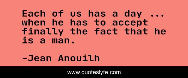 This page presents the quote "Each of us has a day ... when he has to accept finally the fact that he is a man.". Author of this quote is Jean Anouilh. This quote is about self, acceptance,.
