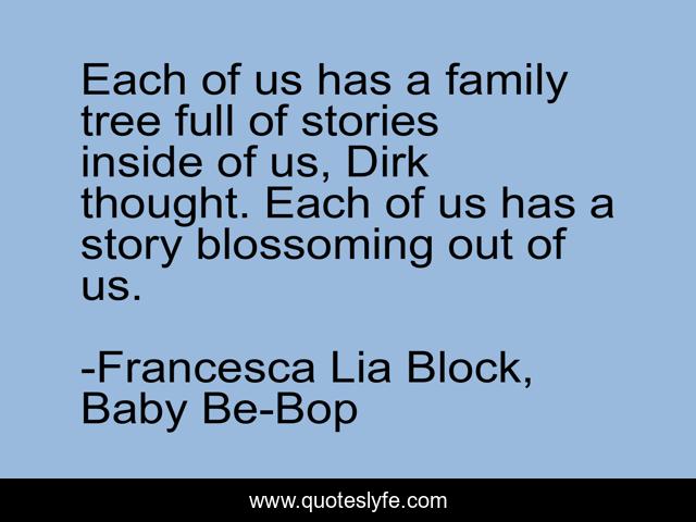 This page presents the quote "Each of us has a family tree full of stories inside of us, Dirk thought. Each of us has a story blossoming out of us.". Author of this quote is Francesca Lia Block, Baby Be-Bop. This quote is about stories, family,.