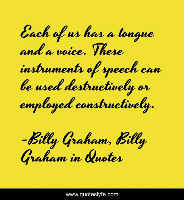 This page presents the quote "Each of us has a tongue and a voice. These instruments of speech can be used destructively or employed constructively.". Author of this quote is Billy Graham, Billy Graham in Quotes. This quote is about speech, billy-graham,.