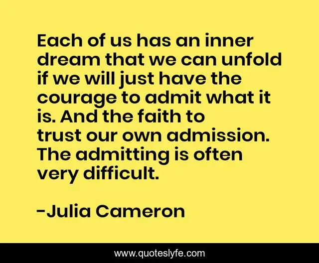 This page presents the quote "Each of us has an inner dream that we can unfold if we will just have the courage to admit what it is. And the faith to trust our own admission. The admitting is often very difficult.". Author of this quote is Julia Cameron. This quote is about faith, goals, dreams,.