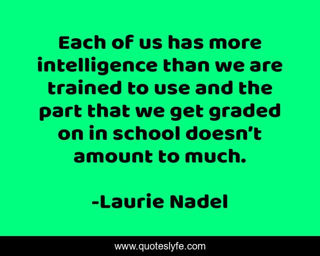 This page presents the quote "Each of us has more intelligence than we are trained to use and the part that we get graded on in school doesn’t amount to much.". Author of this quote is Laurie Nadel. This quote is about education-system, intuition, power-of-thoughts, intelligence, dan-rather, wayne-dyer, inspirational, quote-about-life, enthusiasm,.