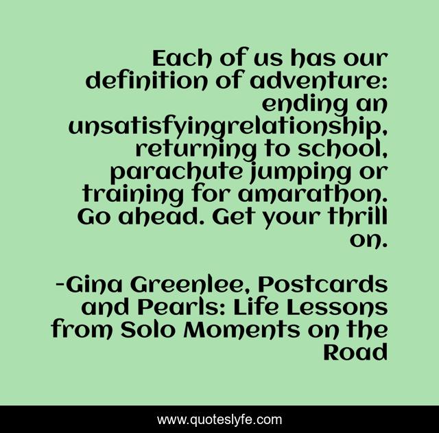 This page presents the quote "Each of us has our definition of adventure: ending an unsatisfyingrelationship, returning to school, parachute jumping or training for amarathon. Go ahead. Get your thrill on.". Author of this quote is Gina Greenlee, Postcards and Pearls: Life Lessons from Solo Moments on the Road. This quote is about confidence, adventure-travel, positive, motivational, adventure-stories, thrill, optimistic, inspirational, risk-it-be-different,.