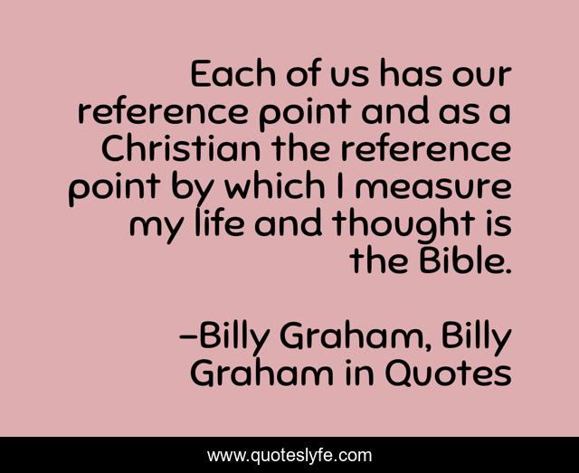 This page presents the quote "Each of us has our reference point and as a Christian the reference point by which I measure my life and thought is the Bible.". Author of this quote is Billy Graham, Billy Graham in Quotes. This quote is about bible, billy-graham,.