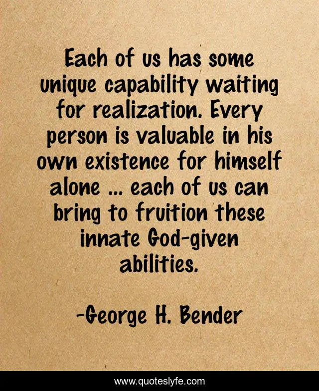 This page presents the quote "Each of us has some unique capability waiting for realization. Every person is valuable in his own existence for himself alone ... each of us can bring to fruition these innate God-given abilities.". Author of this quote is George H. Bender. .