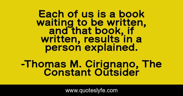 This page presents the quote "Each of us is a book waiting to be written, and that book, if written, results in a person explained.". Author of this quote is Thomas M. Cirignano, The Constant Outsider. This quote is about osracism, boston, irish-mob, nonfiction, fitting-in, castle-island, dorchester, cirignano, boston-harbor,.