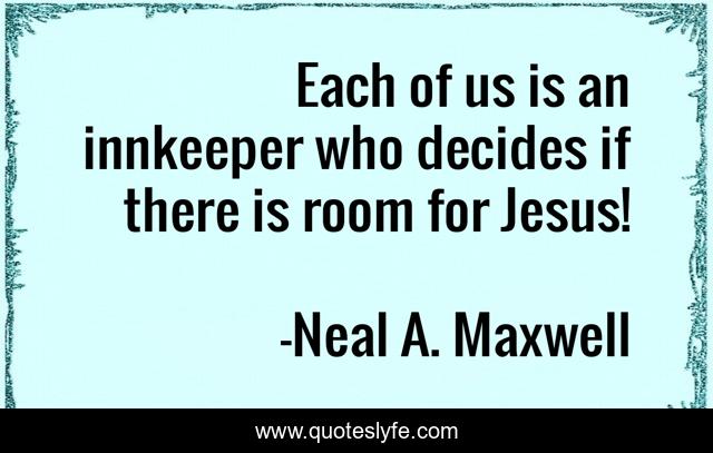 This page presents the quote "Each of us is an innkeeper who decides if there is room for Jesus!". Author of this quote is Neal A. Maxwell. This quote is about maxwell, jesus, innkeeper, inspirational, enthusiasm,.