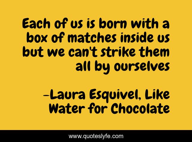 This page presents the quote "Each of us is born with a box of matches inside us but we can't strike them all by ourselves". Author of this quote is Laura Esquivel, Like Water for Chocolate. This quote is about fire, lust, matches, love, affection,.
