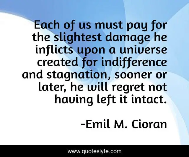 This page presents the quote "Each of us must pay for the slightest damage he inflicts upon a universe created for indifference and stagnation, sooner or later, he will regret not having left it intact.". Author of this quote is Emil M. Cioran. This quote is about universe, purpose, regrets,.