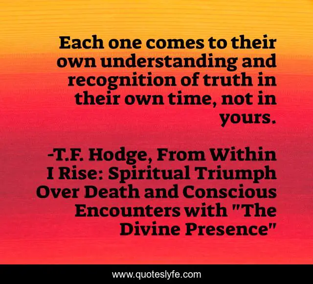 This page presents the quote "Each one comes to their own understanding and recognition of truth in their own time, not in yours.". Author of this quote is T.F. Hodge, From Within I Rise: Spiritual Triumph Over Death and Conscious Encounters with "The Divine Presence". This quote is about quotes-to-live-by, t-f-hodge,.
