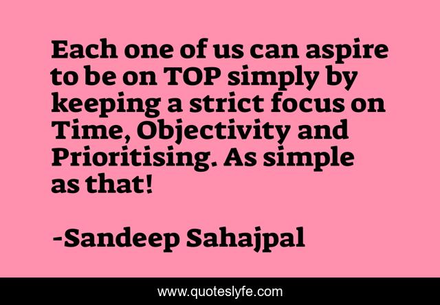This page presents the quote "Each one of us can aspire to be on TOP simply by keeping a strict focus on Time, Objectivity and Prioritising. As simple as that!". Author of this quote is Sandeep Sahajpal. This quote is about confidence, success, on-top-of-the-world, positive, motivational, focus, priorities, prioritisation, optimistic,.