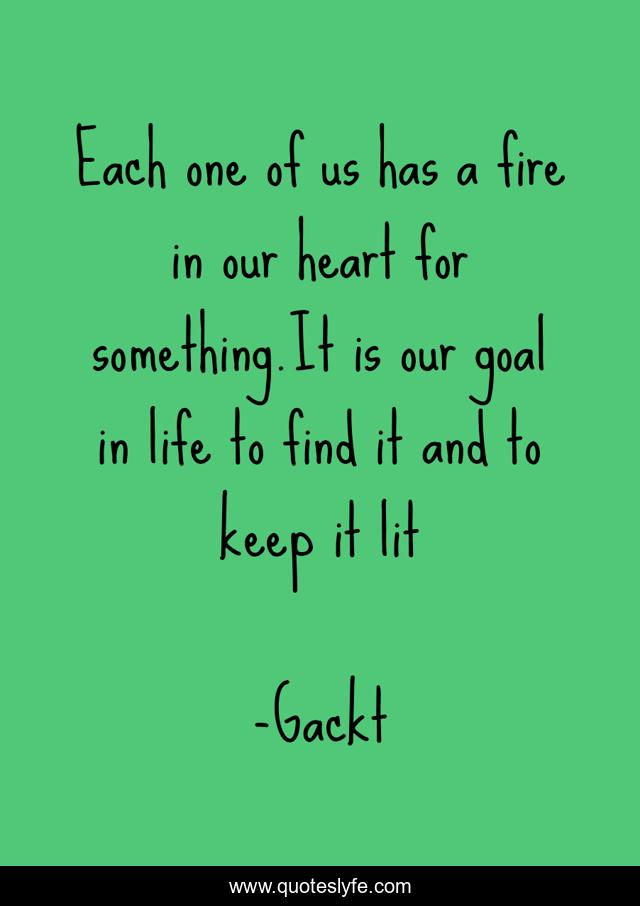 This page presents the quote "Each one of us has a fire in our heart for something.It is our goal in life to find it and to keep it lit". Author of this quote is Gackt. This quote is about fire, heart, life, gackt, goal,.