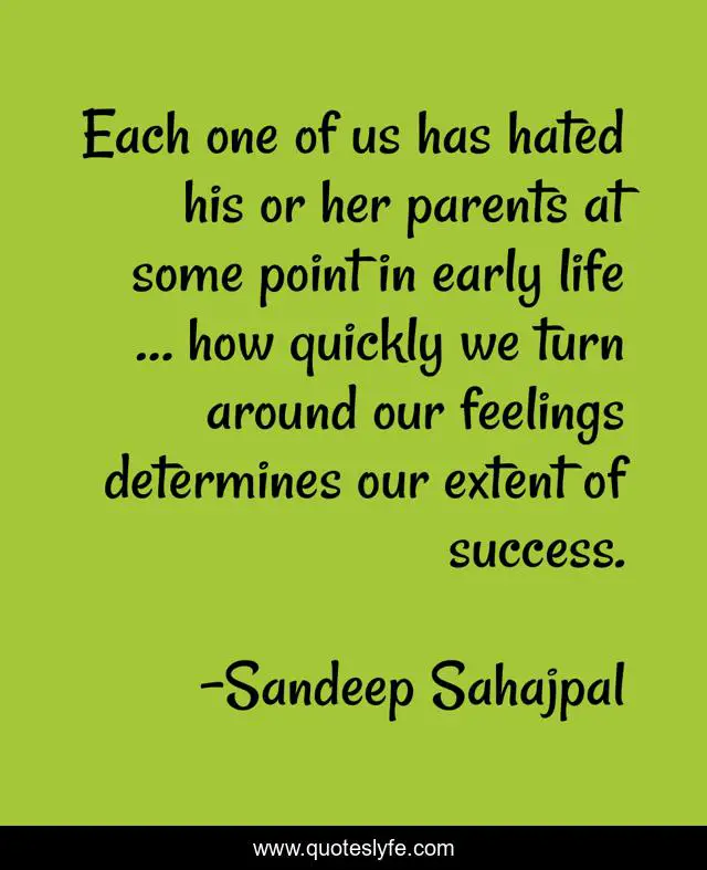 This page presents the quote "Each one of us has hated his or her parents at some point in early life … how quickly we turn around our feelings determines our extent of success.". Author of this quote is Sandeep Sahajpal. This quote is about parents, success,.