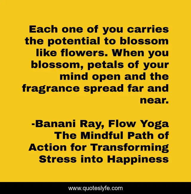 This page presents the quote "Each one of you carries the potential to blossom like flowers. When you blossom, petals of your mind open and the fragrance spread far and near.". Author of this quote is Banani Ray, Flow Yoga The Mindful Path of Action for Transforming Stress into Happiness. This quote is about yoga, mindfulness, flow, awakening, yoga-inspiration, mind-power,.
