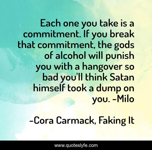 This page presents the quote "Each one you take is a commitment. If you break that commitment, the gods of alcohol will punish you with a hangover so bad you'll think Satan himself took a dump on you. -Milo". Author of this quote is Cora Carmack, Faking It. This quote is about funny, relationship, joke, advice, random, friendship-and-love, comedy,.