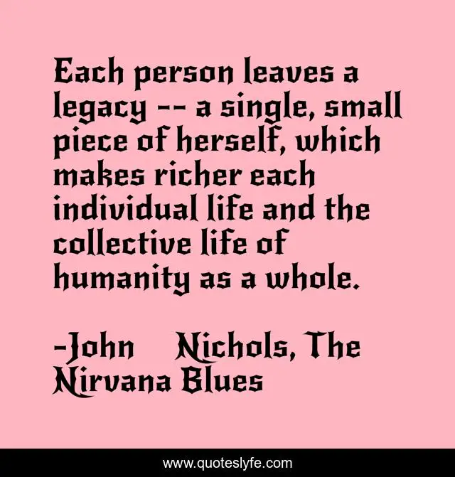 This page presents the quote "Each person leaves a legacy -- a single, small piece of herself, which makes richer each individual life and the collective life of humanity as a whole.". Author of this quote is John Nichols, The Nirvana Blues. This quote is about life, legacy, enrichment, humanity,.