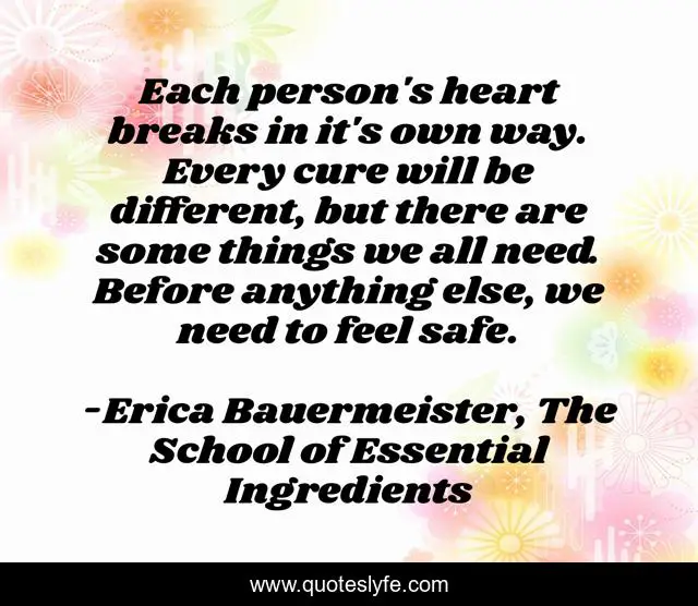 This page presents the quote "Each person's heart breaks in it's own way. Every cure will be different, but there are some things we all need. Before anything else, we need to feel safe.". Author of this quote is Erica Bauermeister, The School of Essential Ingredients. .