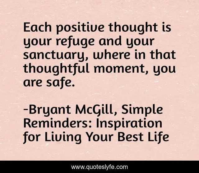 This page presents the quote "Each positive thought is your refuge and your sanctuary, where in that thoughtful moment, you are safe.". Author of this quote is Bryant McGill, Simple Reminders: Inspiration for Living Your Best Life. This quote is about sanctuary, positivity, thoughtful, safety, thoughts, refuge, momentary,.