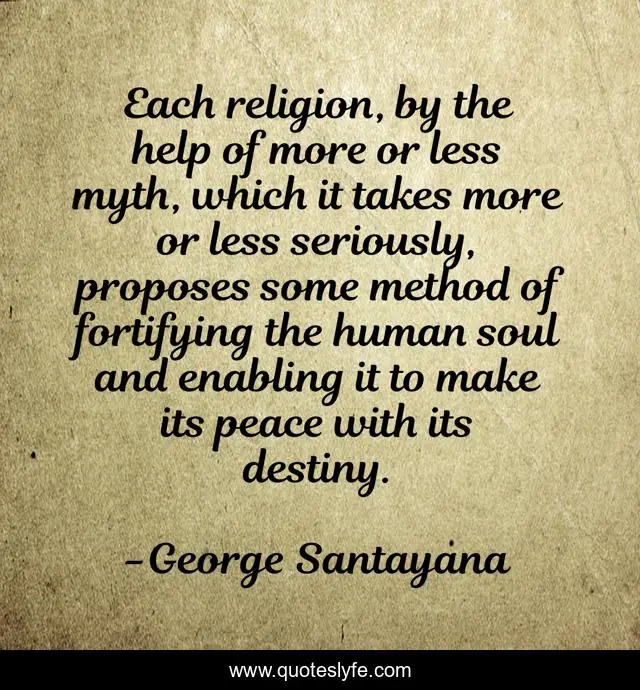 This page presents the quote "Each religion, by the help of more or less myth, which it takes more or less seriously, proposes some method of fortifying the human soul and enabling it to make its peace with its destiny.". Author of this quote is George Santayana. This quote is about peace, soul, help,.