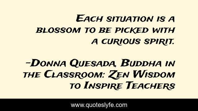 This page presents the quote "Each situation is a blossom to be picked with a curious spirit.". Author of this quote is Donna Quesada, Buddha in the Classroom: Zen Wisdom to Inspire Teachers. This quote is about inspiration, zen, wisdom,.