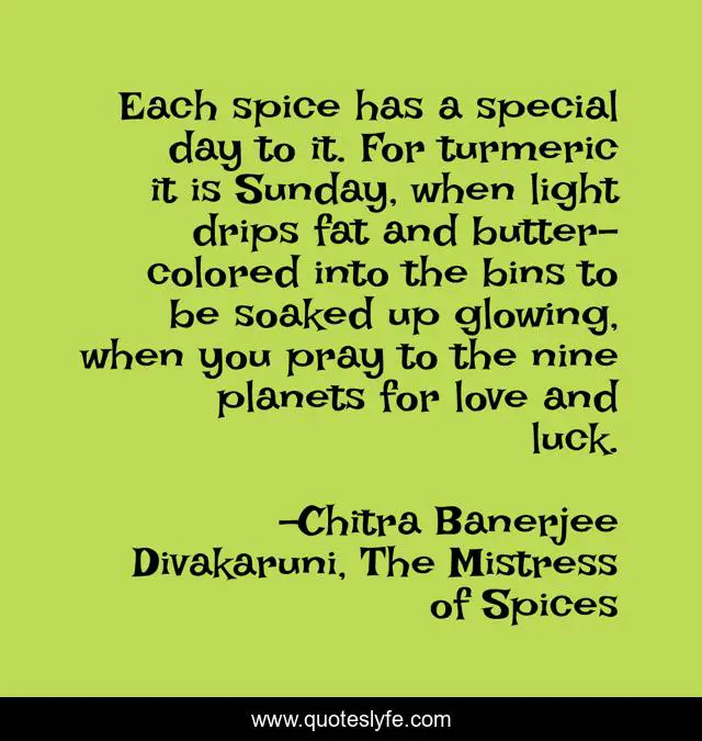 This page presents the quote "Each spice has a special day to it. For turmeric it is Sunday, when light drips fat and butter-colored into the bins to be soaked up glowing, when you pray to the nine planets for love and luck.". Author of this quote is Chitra Banerjee Divakaruni, The Mistress of Spices. This quote is about love, sunday, luck, spice, affection, turmeric,.